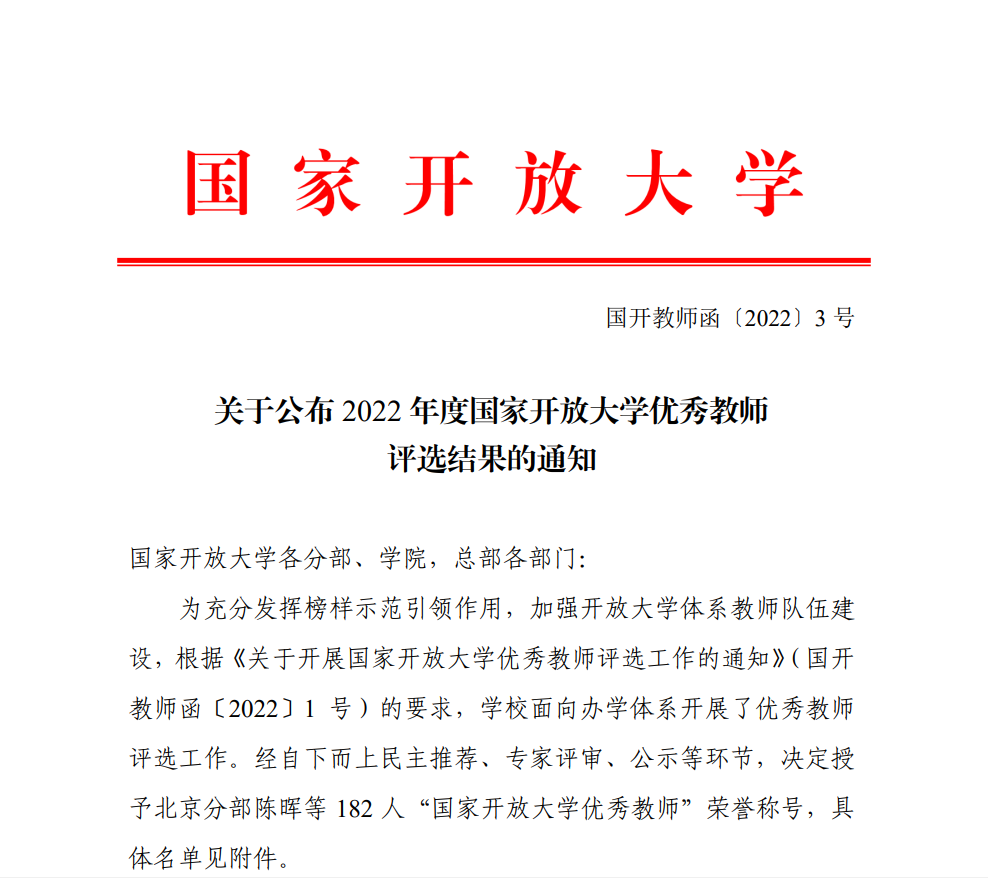 本次全国共有47所分部、学院参加评选,经民主推荐、专家评审、公示等环节,最终评选出“国家开放大学优秀教师”182人。