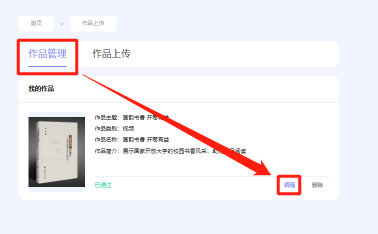 如需对已上传作品进行修改,请在活动主页点击“作品上传”—“作品管理”,点击“编辑”,即可对作品内容进行修改。修改后重新提交即可。重新提交的作品须等待审核,审核通过后将替代原作品。