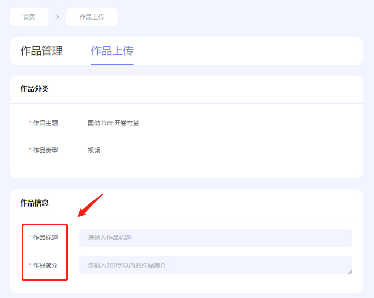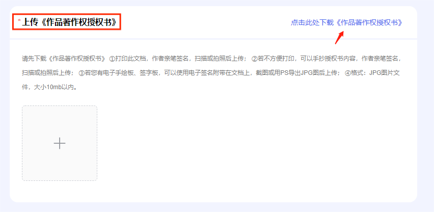 进入“作品上传”页面,输入作品相关信息。点击《作品著作权授权书》模板,填写签名后拍照/扫描上传即可。