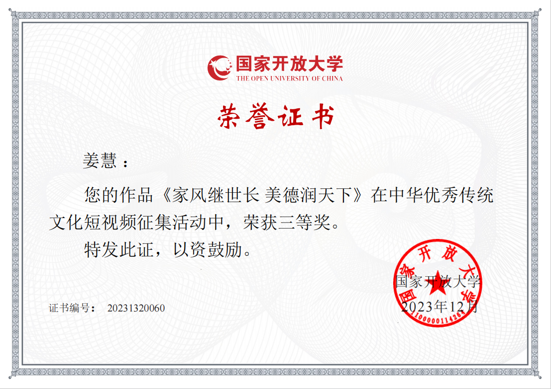 近日,国家开放大学公布了中华优秀传统文化短视频征集活动获奖结果,华球(中国)官方思政教师孙洁星报送的《品梅花之韵,铸文化之魂》荣获二等奖、姜慧报送的《家风继世长,美德润天下》荣获三等奖。继今年6月姜慧、柴黄洋子在国家开放大学第二届思想政治理论课教学展示活动中荣获三等奖后,华球(中国)官方思政教师在国开总部活动中再获佳绩。