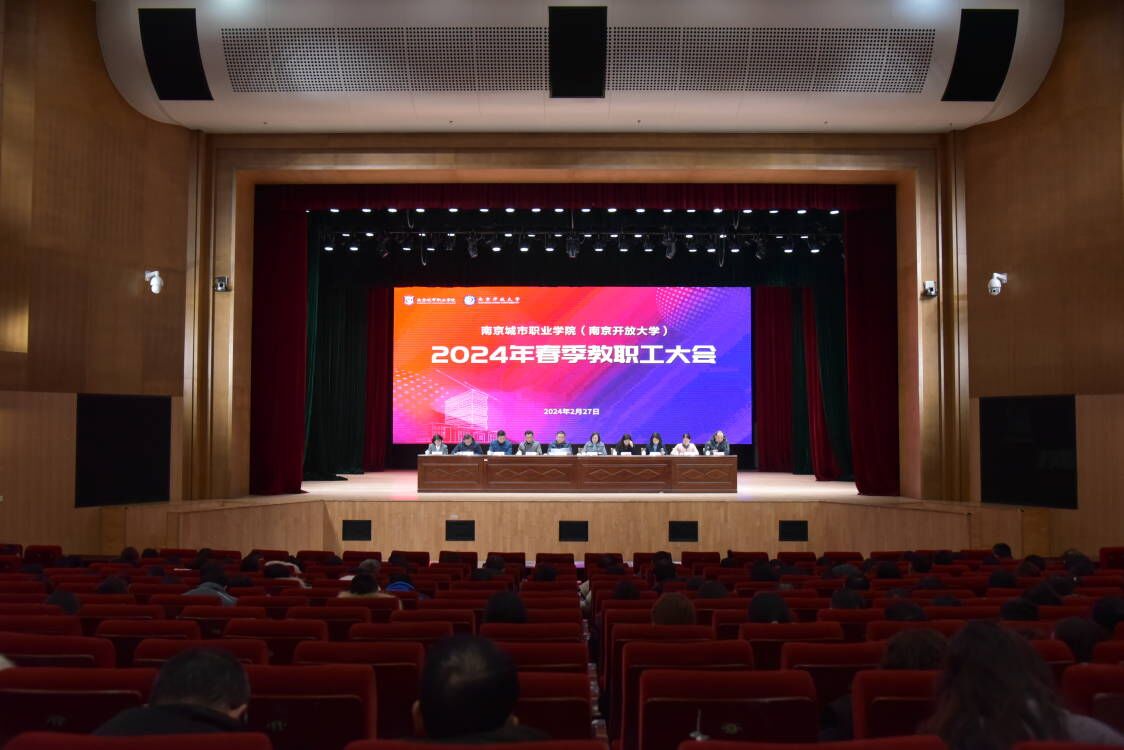党委副书记、校长倪杰同志部署2024年学校工作。她指出,2023年,全校教工紧密团结,埋头苦干,砥砺前行,克服了前进道路上的困难,取得了沉甸甸的收获。以此为发展基础,我们更要把握新时代的任务要求,积极应对高质量发展的机遇挑战要学习贯彻好教育的“三重属性”,始终坚守政治属性、战略属性和民生属性。要深刻认识到实现职业教育“双高”建设、开放教育转型及“两教”融合发展所存在的短板弱项,加强专业建设对接南京市现代化产业体系,推动师资队伍培育和发展走上快车道,进一步开阔开放教育转型构建全面终身学习教育体系的发展思路。聚焦2024年重点工作,推进“两教”创新融合展现新作为,她重点强调了六个方面的工作。一是加强党的全面领导,推动学校事业高质量发展;二是坚守立德树人使命,夯实“三全育人”工作体系责任;三是深化产教融合成效,提高职业教育人才培养质量;四是锤炼高尚师德师风,建设“双师型”教师队伍;五是统筹“两教”协同创新,服务全民终身学习社会建设;六是推进学校管理综合改革,实现治理体系和能力现代化。我们将加快建设特色鲜明的新型高等学校,更好扛起“走在前,做示范”的光荣使命,为中国式现代化南京新实践做出更大贡献,以优异成绩向新中国成立75周年献礼。