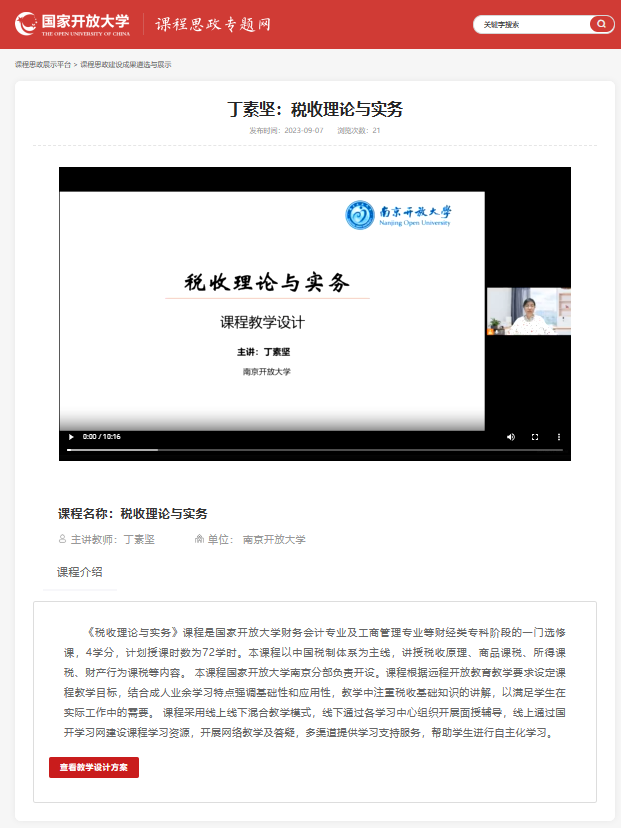 近日,国家开放大学公布了2024年课程思政建设成果遴选名单,华球(中国)官方教师丁素坚的《税收理论与实务》课程思政建设成果于众多申报材料中脱颖而出,在“国家开放大学课程思政专题网”国家开放大学-课程思政展示平台 (ouchn.cn)上进行了宣传展示,供体系内教师学习和交流。