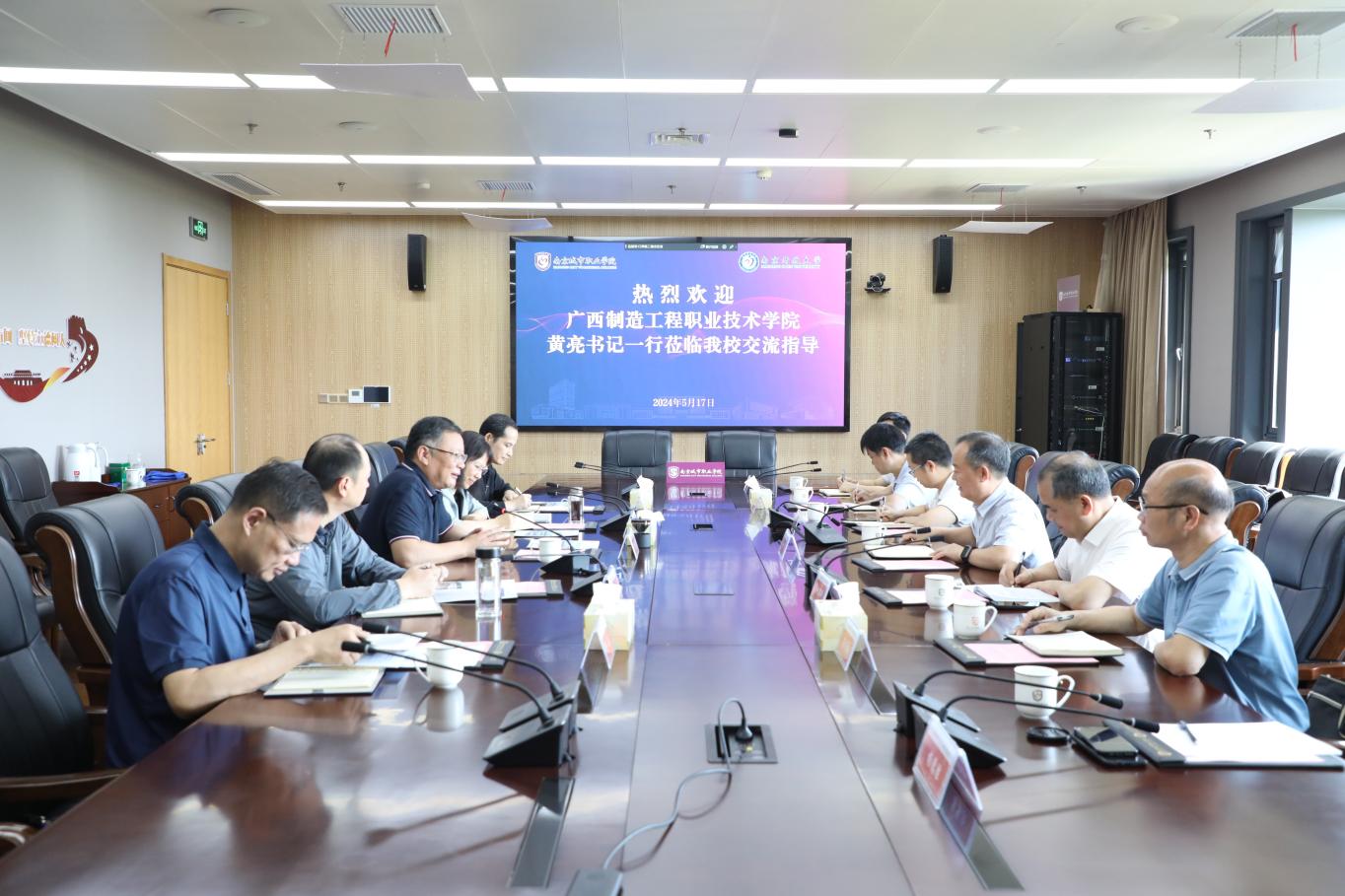 5月17日,广西制造工程职业技术学院党委书记黄亮及副校长赵骏新等一行7人到华球(中国)官方调研交流。校党委书记孙朝晖,党委委员、副校长江景在溧水校区接待了黄书记一行,相关部门负责人参加交流与座谈。