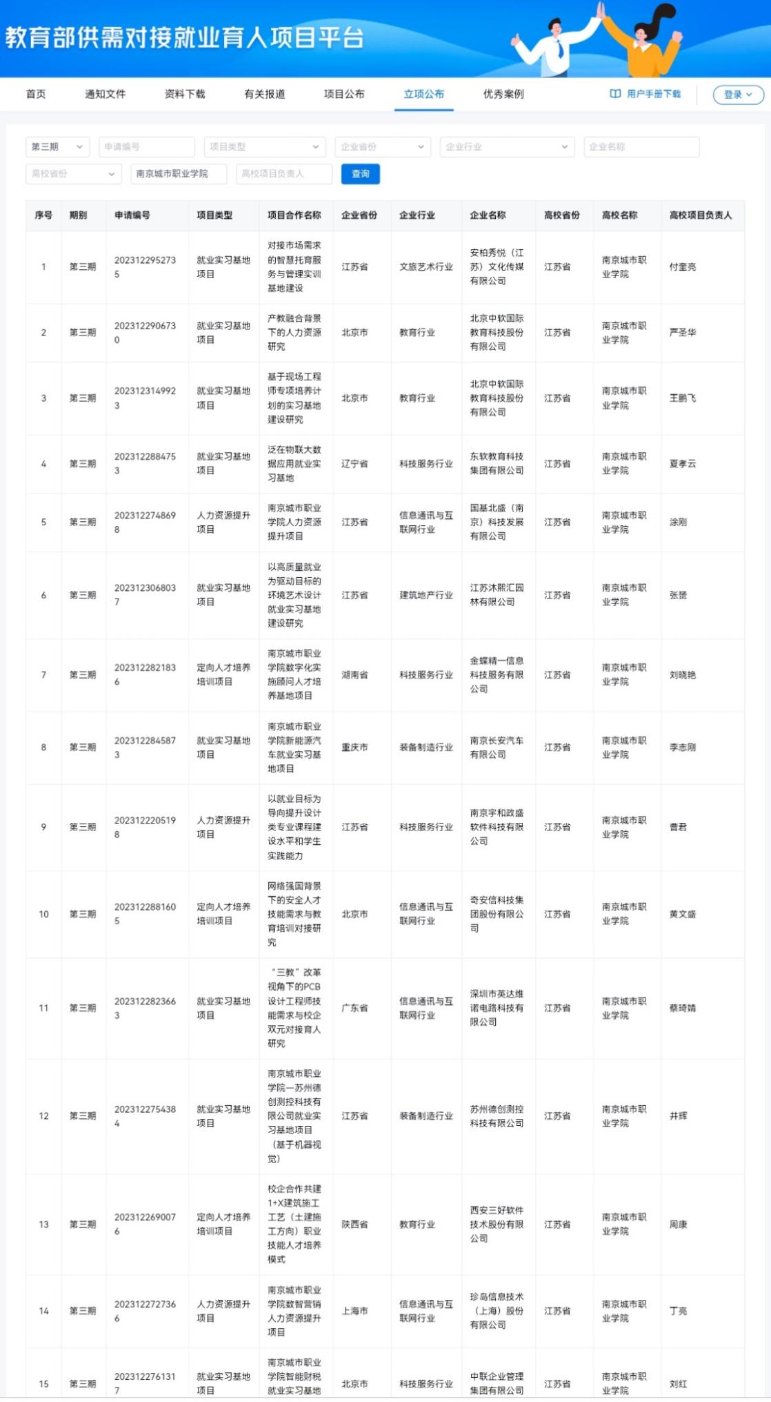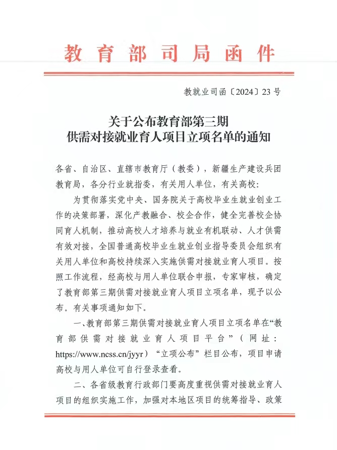 近日,教育部发布了《关于公布教育部第三期供需对接就业育人项目立项名单的通知》(教就业司函〔2024〕23号),华球(中国)官方申报的15个项目全部获批立项,其中就业实习基地项目9个、定向人才培养项目3个、人力资源提升项目3个。