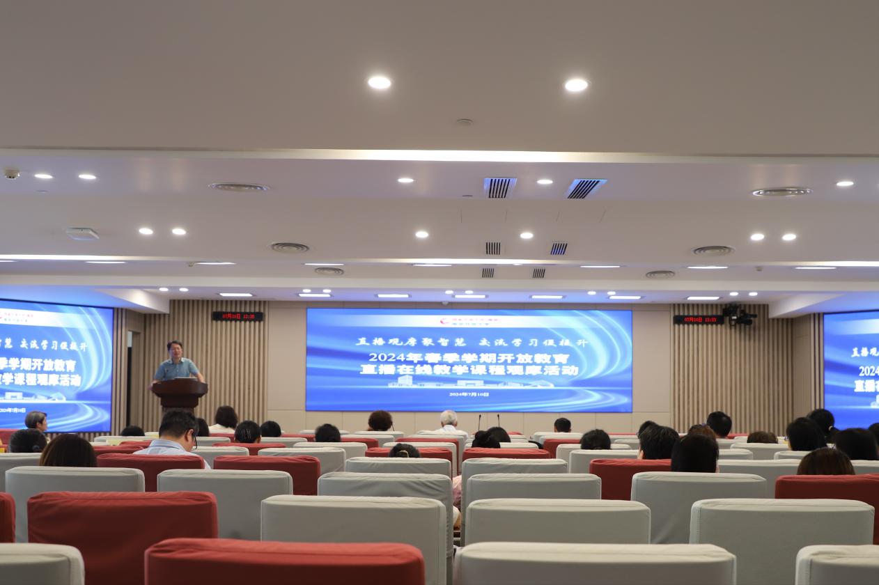 继续教育中心副主任乐艺就开放教育直播在线教学的评价标准、远程听评课数据剖析、存在问题及具体工作要求做了阐述。