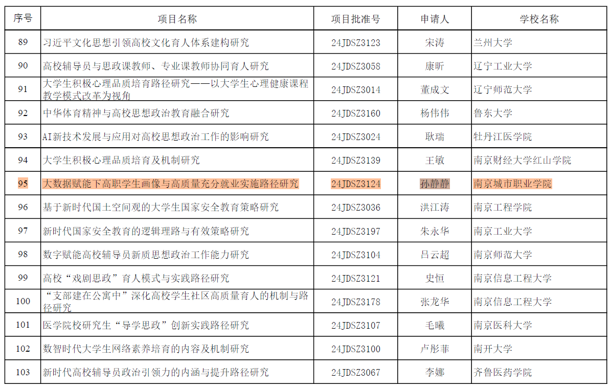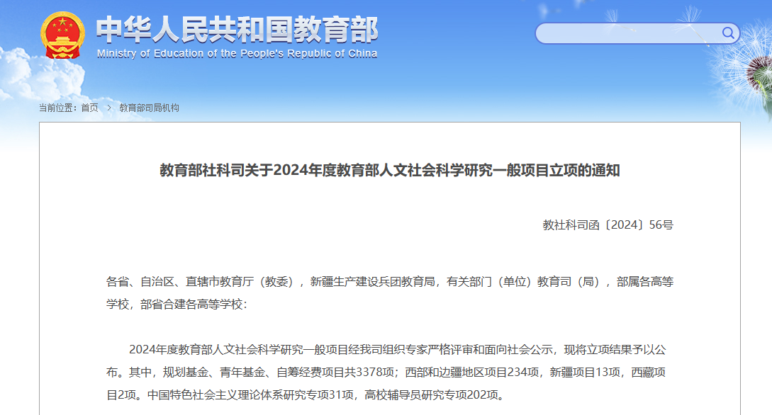 近日,教育部社科司公布了2024年度教育部人文社会科学研究一般项目立项结果,华球(中国)官方数字财商学院辅导员孙静静老师牵头申报的“大数据赋能下高职学生画像与高质量充分就业实施路径研究”获批2024年度教育部人文社会科学研究专项任务项目(高校辅导员研究)立项。