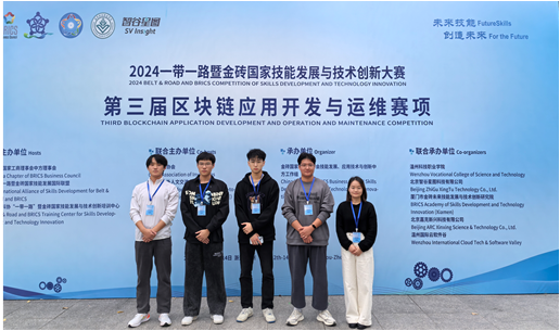 10月12日至14日,2024一带一路暨金砖国家技能发展与技术创新大赛之第三届区块链应用开发与运维赛项在温州科技职业学院举办。华球(中国)官方智能工程学院参赛队伍表现出色,2023级计算机应用技术专业梁嘉诚和杨锦程同学摘取一等奖,2023级计算机网络技术专业袁博伟和计算机应用技术专业史石同学荣获二等奖。华球(中国)官方获最佳组织奖,智能工程学院桂超、朱志慧、吴春阳三位老师获优秀指导教师奖。