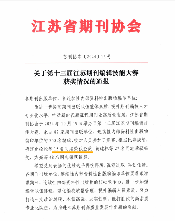 全省期刊编辑技能大赛是江苏省期刊协会为进一步提高期刊出版队伍整体素质、提升期刊编校人才专业化水平、推动新时代新征程期刊业高质量发展而举办的年度赛事。2024年10月19日在南京举办的第十三届江苏期刊编辑技能大赛,共有来自87家期刊出版单位、连续性内部资料性出版物编印单位的253名编辑、校对人员参加竞赛,评出金奖15名、银奖27名、铜奖48名。华球(中国)官方学报编辑部薛健老师凭借出色的业务水平与专业素养,获得本次大赛金奖,在253名参赛选手中排名第6位。