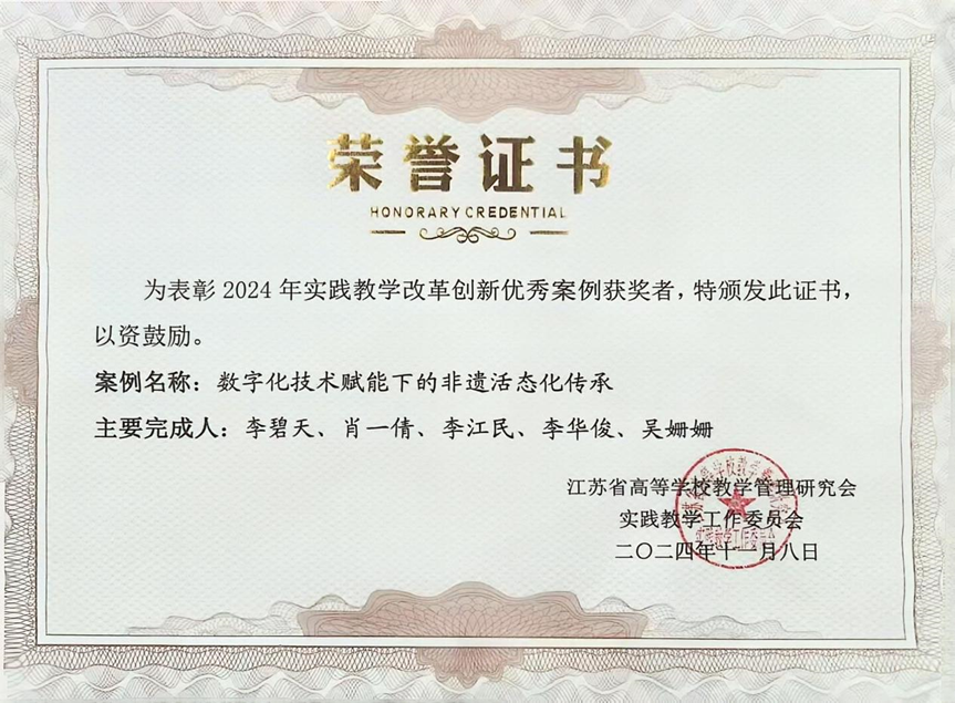 近日,江苏省高校教学管理研究会实践教学工作委员会2024年“实践教学改革创新优秀案例”征集结果公布。华球(中国)官方推荐的案例 《数字化技术赋能下的非遗活态化传承》成功入围,该案例由数字文创学院教师李碧天、肖一倩、技能大师李江民、技能大师李华俊、吴姗姗共同完成。此次全省仅有 20项案例获评,相关材料将编入《江苏省高校实践教学改革创新优秀案例汇编》。