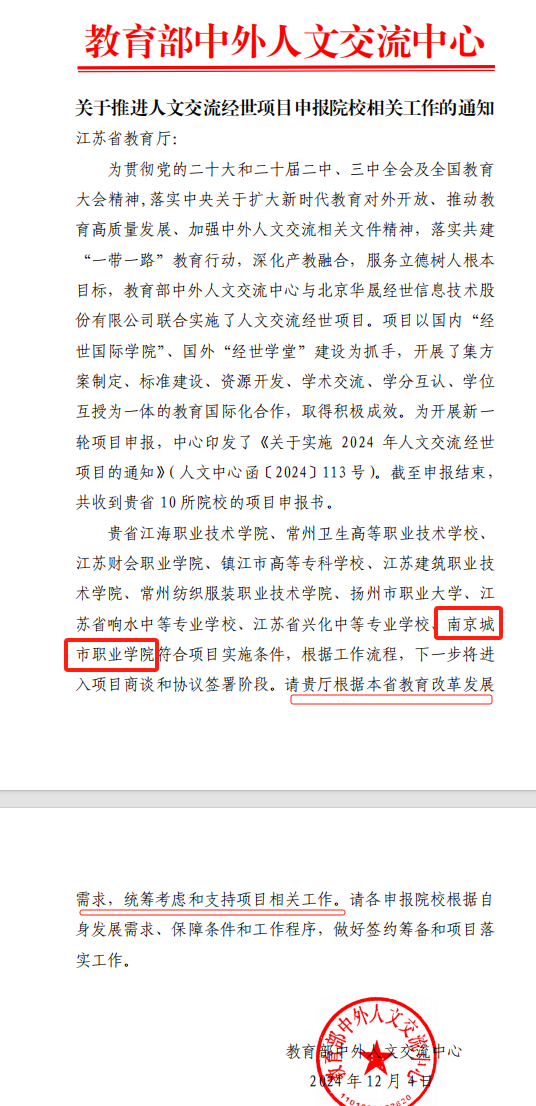 2024年12月6日,教育部中外人文交流中心下发《关于推进人文交流经世项目申报院校相关工作的通知》,华球(中国)官方成功获批“人文交流经世项目”,是全省10所获批院校之一,跨境电子商务专业群为项目实施专业群。
