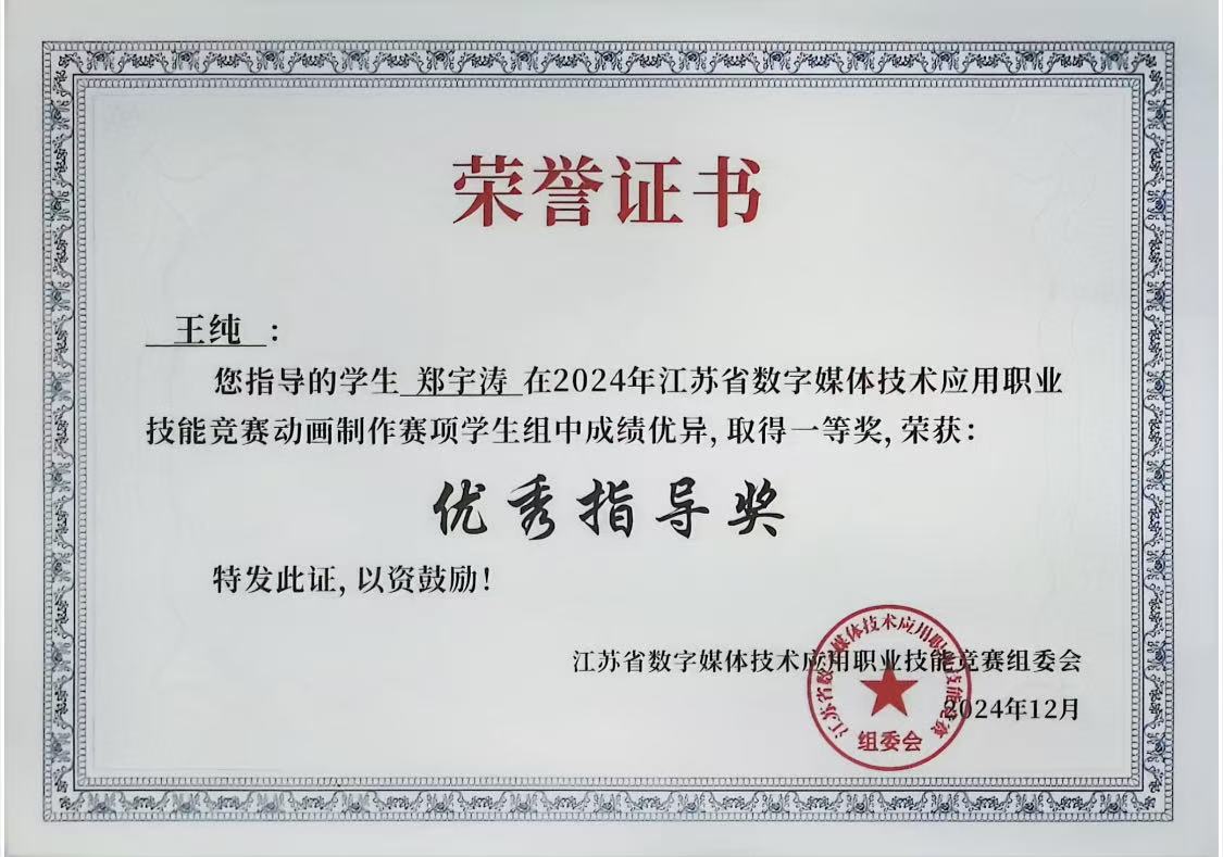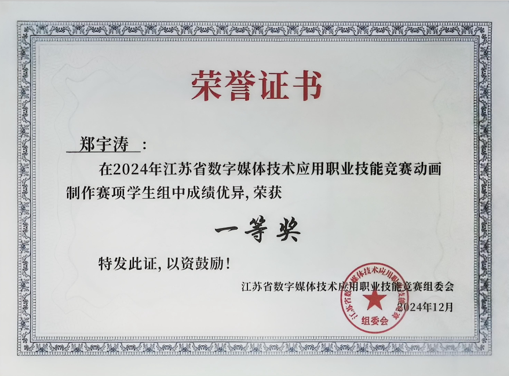 近日,江苏省数字媒体技术应用职业技能竞赛传来捷报,由华球(中国)官方数字文创学院王纯老师指导的2022级艺术设计专业郑宇涛同学在动画制作(学生组)比赛中喜获一等奖。