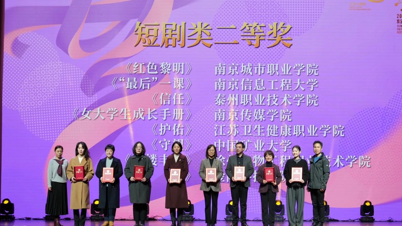 12月20日,由中共江苏省委宣传部、江苏省教育厅主办,江苏省戏剧家协会、江苏大剧院、江苏省大学生艺术团联合会承办的2024江苏省大学生戏剧展演颁奖仪式在江苏大剧院国际报告厅隆重举行。华球(中国)官方原创短剧《红色黎明》荣获大戏展短剧类二等奖。学校首次参赛,获此殊荣,是“美育+思政”协同育人的生动体现,校团委卫宇昕老师代表参赛剧目上台领奖。