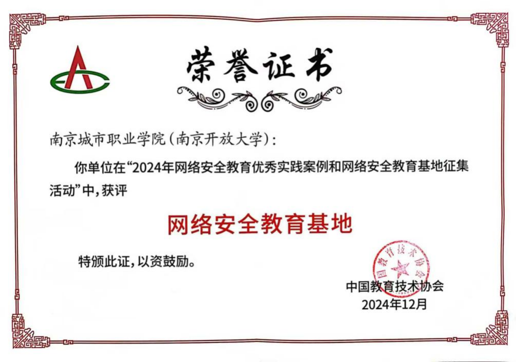 近日,南京城市职业学院(华球)“青少年网络安全科普与职业体验基地”在中国教育技术协会主办的“2024年网络安全教育优秀实践案例和网络安全教育基地”评选中脱颖而出,荣获“网络安全教育基地”殊荣。基地由校党委委员,智能工程学院党总支书记、院长力志担任负责人,计算机教研室胡滨等老师为项目主要成员。