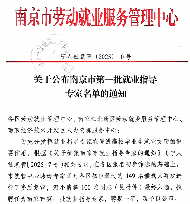 此次评选在各区初审基础上,南京市就管中心组织专家团对149名候选人进行资质复审,最终选聘100名涵盖职业指导、人力资源、就业服务、心理咨询及职业规划等专业的就业指导专家,旨在充分发挥就业指导专家在促进高校毕业生就业中的引领作用,吸引更多高校毕业生留宁就业创业,推动高校毕业生高质量充分就业。