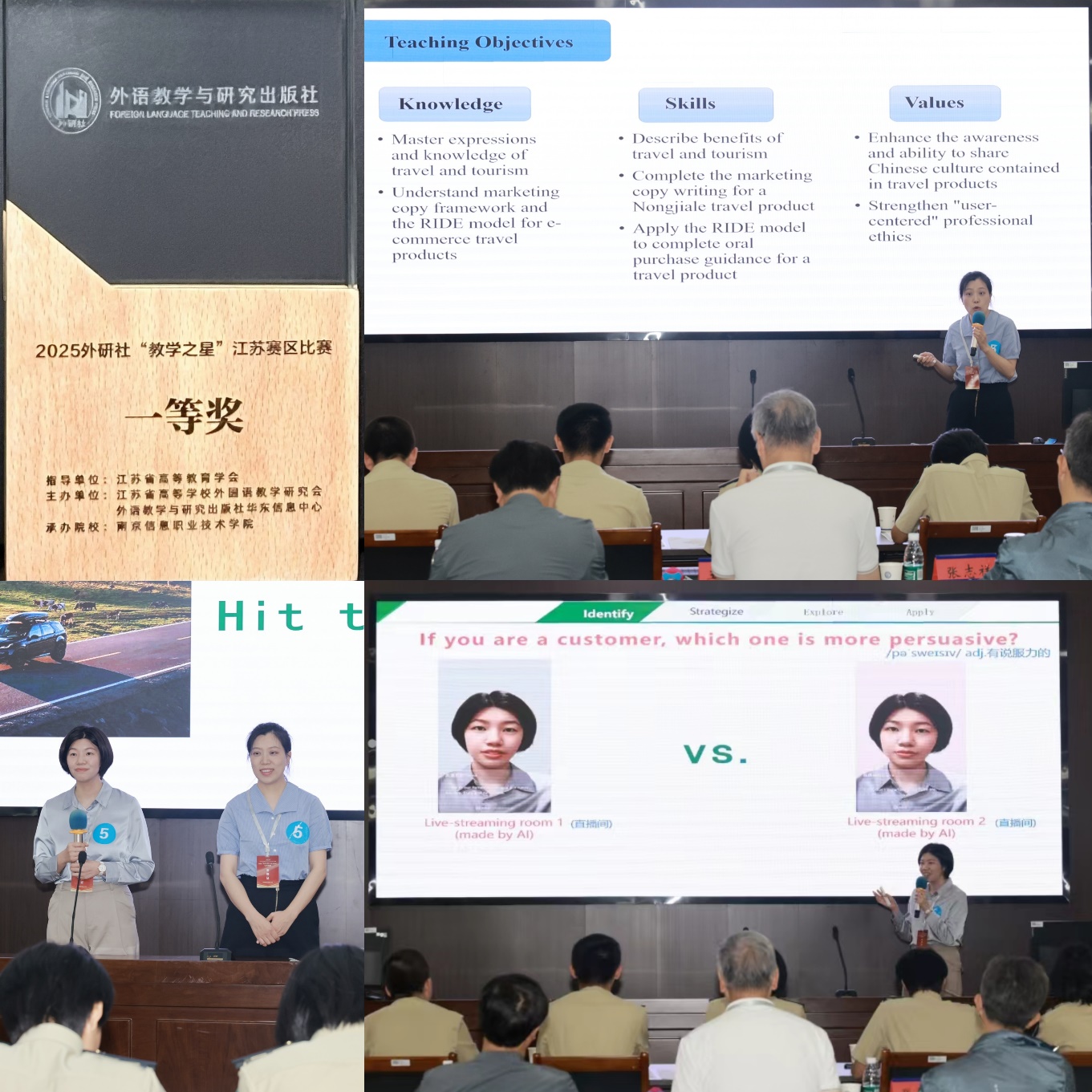 6月21日至22日,2025外研社全国高校外语教师“教学之星”大赛江苏赛区比赛在南京信息职业技术学院举行。华球(中国)官方公共教学部潘敏、支婷婷、赵羽涵、沈玲教师团队代表华球(中国)官方首次参赛,荣获高职组一等奖(最高等次奖项)第二名,成功晋级全国半决赛。