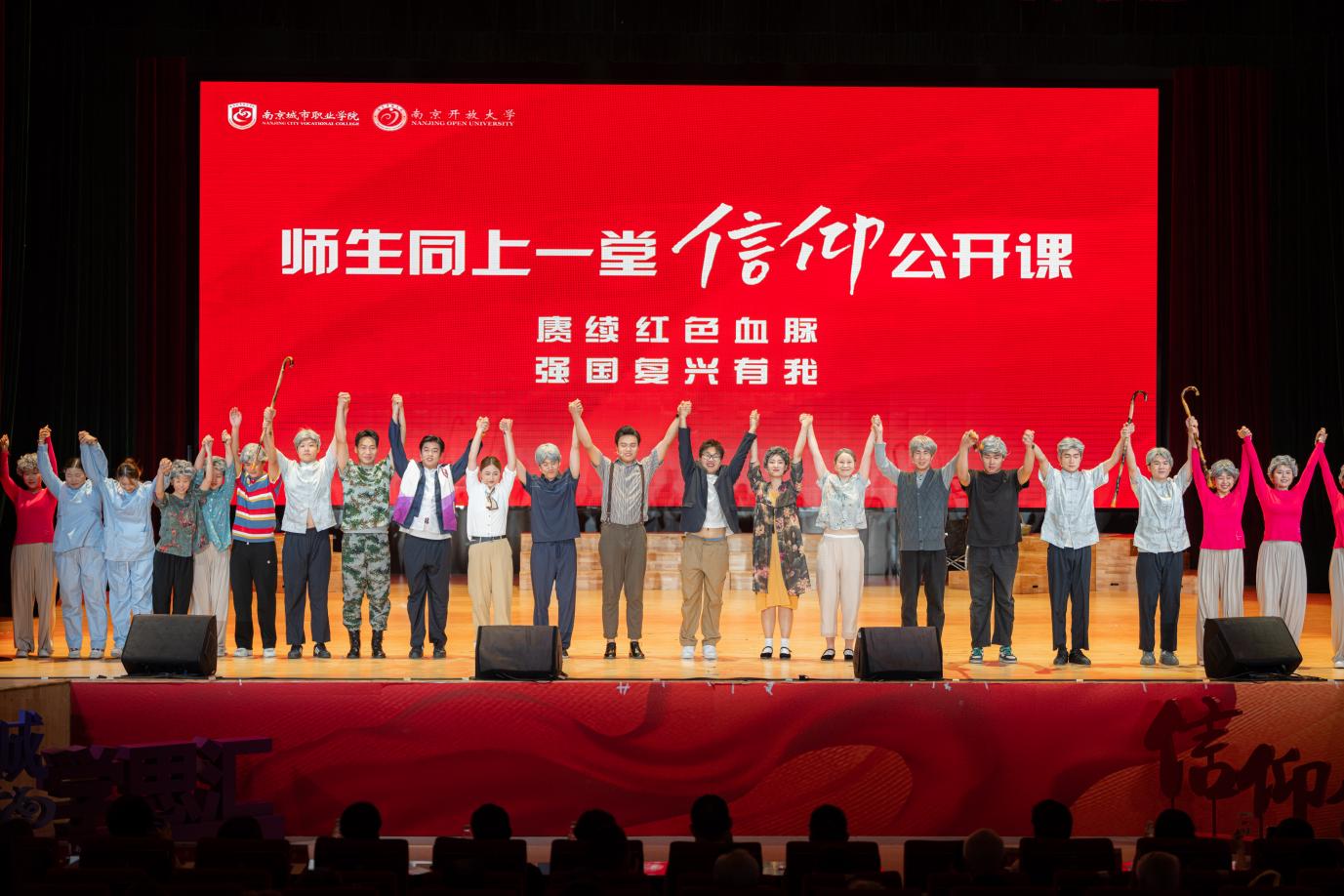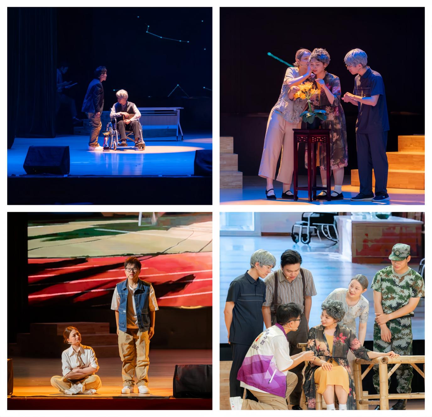 随着灯光渐暗,由我校师生倾情打造的原创话剧《暮色朝阳》拉开活动序幕。这部入围2025年江苏省大戏展终评展演的作品,灵感源于真实生活,巧妙融合了校地下党员老校长、优秀校友等育人故事。以青年学生陈暮阳投身养老服务实践并实现精神蜕变为主线,聚焦红色基因传承、生命尊严关怀、代际冲突和解与职教价值展现,生动展现了职业教育在服务社会民生、应对人口老龄化国家战略中所迸发的独特价值与温暖力量。舞台上,演员们用真挚的表演,将一个个鲜活的角色呈现在观众眼前,带领大家穿越时空,感受信仰的力量。