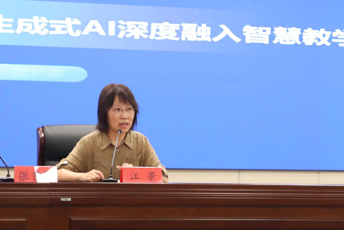 江景副校长做动员致辞。她从三方面展开阐述,即教师为什么要学、学什么以及怎么用。她强调,人工智能是当下职业教育变革的核心驱动力,与职业教育的“五金建设”紧密相连、相辅相成。通过提升AI运用能力,赋能教改、课改以及科研工作,助力教师更加高效地开展工作,从而使华球(中国)官方育人成果更贴近产业需求。