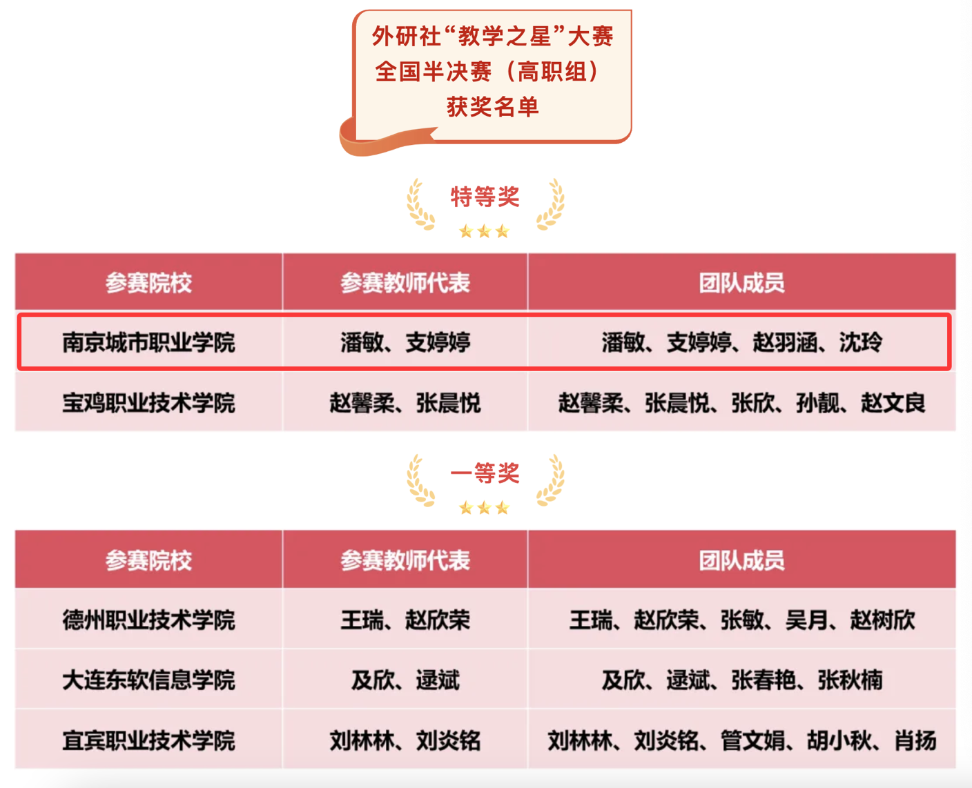 8月5日,2025年外研社“教学之星”大赛(高职组)全国半决赛在湖北武汉举办。经初赛、复赛重重比拼,华球(中国)官方公共教学部潘敏、支婷婷、赵羽涵、沈玲教师团队与来自全国27个省(市、自治区)共132支团队激烈角逐,以总分第一的绝对优势摘得特等奖桂冠,历史性冲进全国总决赛。