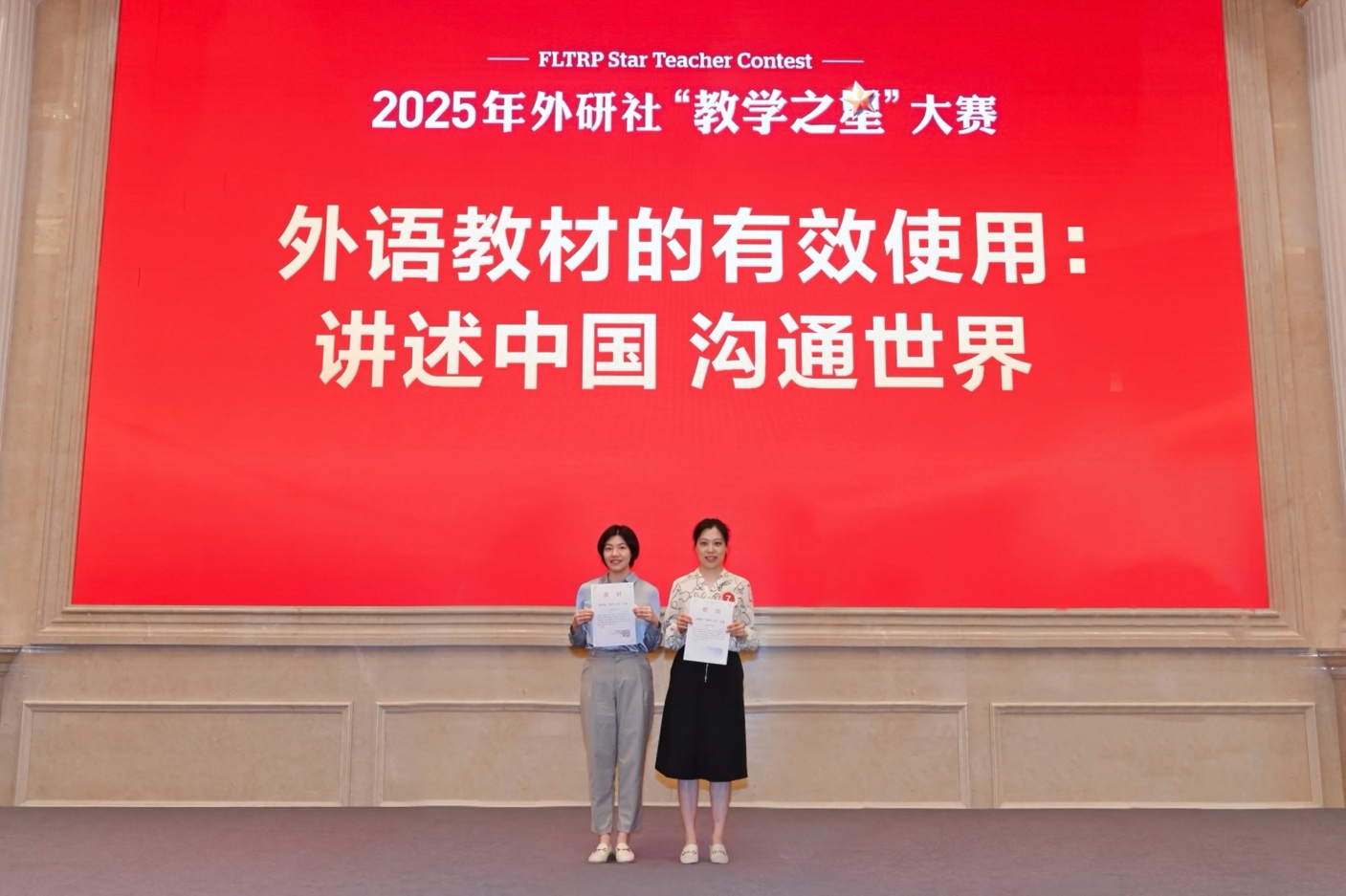 本次大赛主题为“外语教材的有效使用:讲述中国,沟通世界”。潘敏、支婷婷两位老师代表团队赴比赛现场参赛,按照大赛章程,团队负责人潘敏老师进行5分钟的教学设计介绍,教学展示教师支婷婷老师进行10分钟的课堂教学展示,随后两位老师对评委的现场提问分别作答。现场,她们凭借扎实的教学设计和生动的课堂展示,充分展现了对教材的深度挖掘、对数智教学工具的灵活运用以及课程思政的育人成效,赢得评委高度认可,最终获得全场最高分92.50分,斩获特等奖桂冠,并获得现场观众“我心目中的冠军团队”投票第一名。