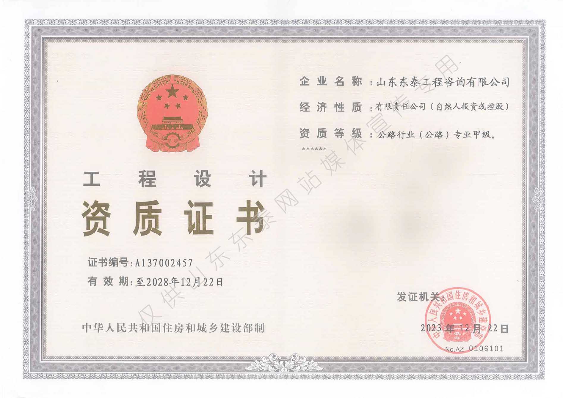 住建部公路行业(公路)专业设计甲级