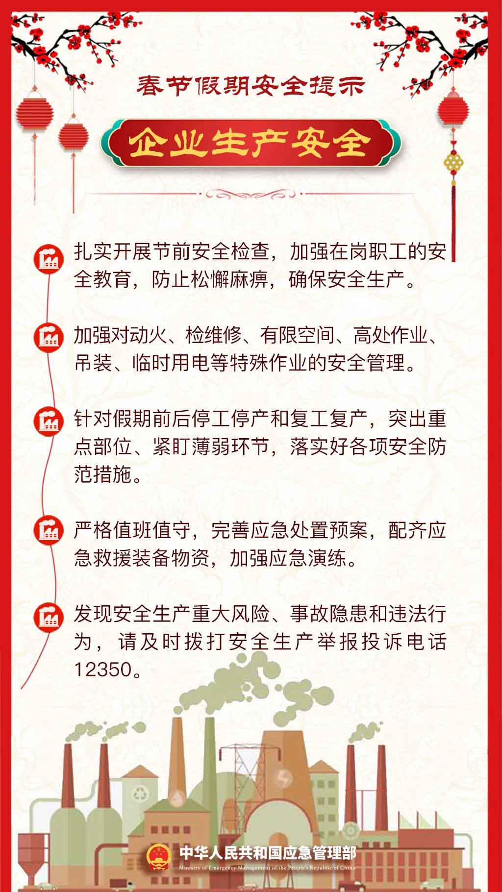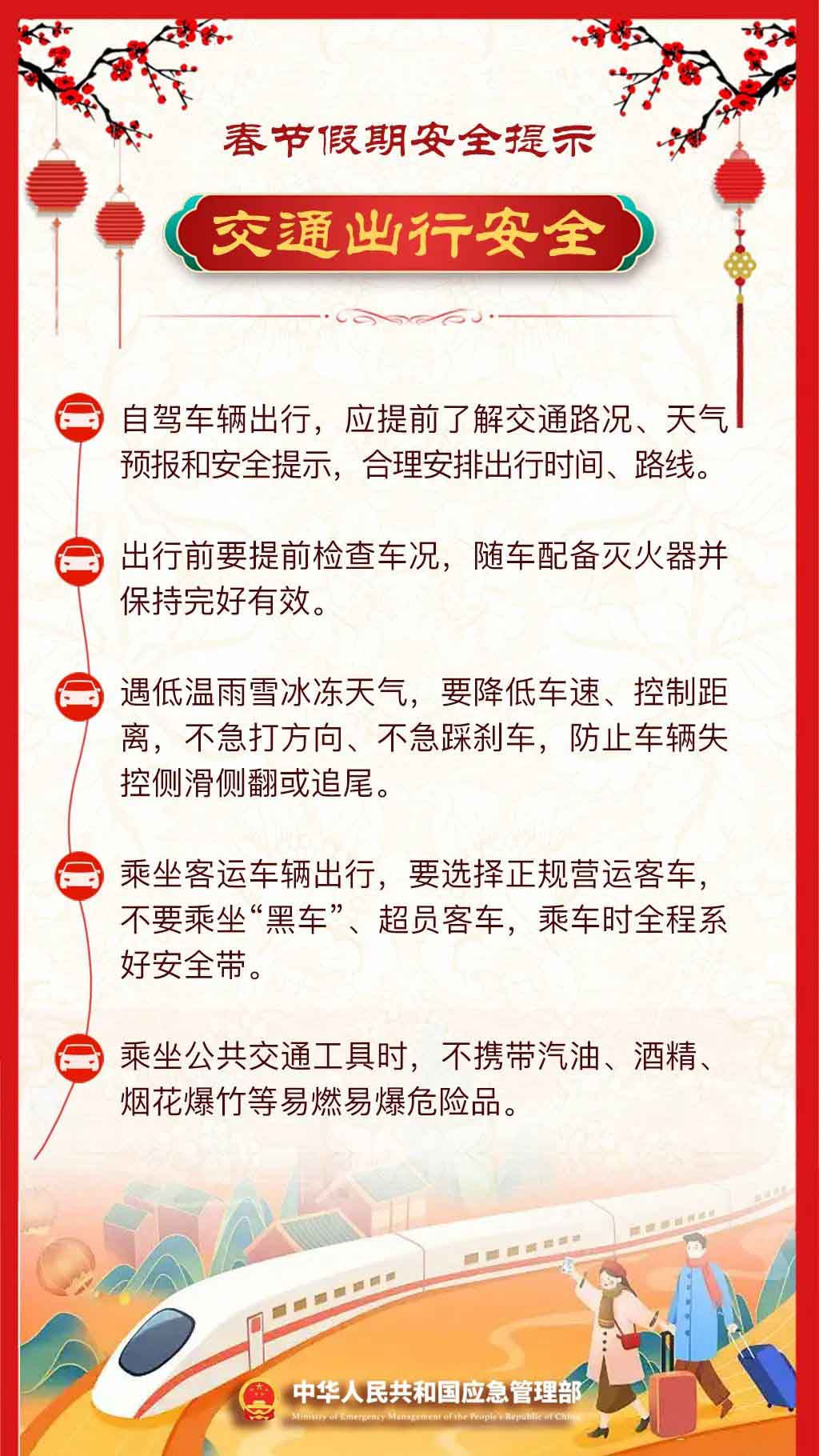article------>{"id":6538,"cid":7,"subCid":null,"title":"2025年春节假期安全提示","shortTitle":"","tagId":"","attr":"","articleView":"","source":"","author":"","description":"春节假期将至\n家庭用火用气用电增加\n自驾出行、客货运输增多\n灯会、庙会、促销庆典等大型活动多\n宾馆饭店客流剧增\n煤炭等企业保供压力加大\n叠加低温雨雪天气\n各类安全风险增加\n这份春节假期安全提示\n请查收!\n↓↓↓\n\n\n\n\n\n\n\n\n\n\n\n\n\n\n\n\n 来源:中国应急管理报融媒体工作部制作...","img":"/public/uploads/default/2025/01/26/1737865526081_source_安全提示.jpg","content":"<p style=\"text-align: center;\" data-mpa-powered-by=\"yiban.io\"><span style=\"font-size: 20px;\">春节假期将至</span></p>\n<p style=\"text-align: center;\"><span style=\"font-size: 20px;\">家庭用火用气用电增加</span></p>\n<p style=\"text-align: center;\"><span style=\"font-size: 20px;\">自驾出行、客货运输增多</span></p>\n<p style=\"text-align: center;\"><span style=\"font-size: 20px;\">灯会、庙会、促销庆典等大型活动多</span></p>\n<p style=\"text-align: center;\"><span style=\"font-size: 20px;\">宾馆饭店客流剧增</span></p>\n<p style=\"text-align: center;\"><span style=\"font-size: 20px;\">煤炭等企业保供压力加大</span></p>\n<p style=\"text-align: center;\"><span style=\"font-size: 20px;\">叠加低温雨雪天气</span></p>\n<p style=\"text-align: center;\"><span style=\"font-size: 20px;\">各类安全风险增加</span></p>\n<p style=\"text-align: center;\"><span style=\"font-size: 20px;\">这份春节假期安全提示</span></p>\n<p style=\"text-align: center;\"><span style=\"font-size: 20px;\">请查收!</span></p>\n<p style=\"text-align: center;\"><span style=\"font-size: 20px;\">↓↓↓</span></p>\n<p style=\"text-align: center;\"><img src=\"/public/uploads/default/2025/01/26/1737865982024_source_mceu_69331620331737865968774.jpg\"></p>\n<p style=\"text-align: center;\"><img src=\"/public/uploads/default/2025/01/26/1737865989086_source_mceu_8433769041737865976979.jpg\"></p>\n<p style=\"text-align: center;\"><img src=\"/public/uploads/default/2025/01/26/1737866000161_source_mceu_40644646551737865988059.jpg\"></p>\n<p style=\"text-align: center;\"><img src=\"/public/uploads/default/2025/01/26/1737866009174_source_mceu_20799012461737865997071.jpg\"></p>\n<p style=\"text-align: center;\"><img src=\"/public/uploads/default/2025/01/26/1737866018134_source_mceu_29649665571737866006031.jpg\"></p>\n<p style=\"text-align: center;\"><img src=\"/public/uploads/default/2025/01/26/1737866027890_source_mceu_70610935081737866015784.jpg\"></p>\n<p style=\"text-align: center;\"><img src=\"/public/uploads/default/2025/01/26/1737866038362_source_mceu_78041726991737866026260.jpg\"></p>\n<p style=\"text-align: center;\"><img src=\"/public/uploads/default/2025/01/26/1737866047119_source_mceu_946834890101737866035016.jpg\"></p>\n<p style=\"text-align: center;\"><img src=\"/public/uploads/default/2025/01/26/1737866056159_source_mceu_84389933111737866044057.jpg\"></p>\n<p style=\"text-align: center;\"><img src=\"/public/uploads/default/2025/01/26/1737866063042_source_mceu_407709761121737866050938.jpg\"></p>\n<p style=\"text-align: center;\"><img src=\"/public/uploads/default/2025/01/26/1737866070755_source_mceu_20174096131737866058651.jpg\"></p>\n<p> </p>\n<section>\n<section>\n<section>\n<section>\n<section> 来源:中国应急管理报融媒体工作部制作</section>\n</section>\n</section>\n</section>\n</section>","orderBy":null,"status":0,"pv":442,"link":"","createdAt":"2025-01-26 12:24:50","updatedAt":"2025-07-28 10:17:42","department":null,"field":{},"tags":[]}