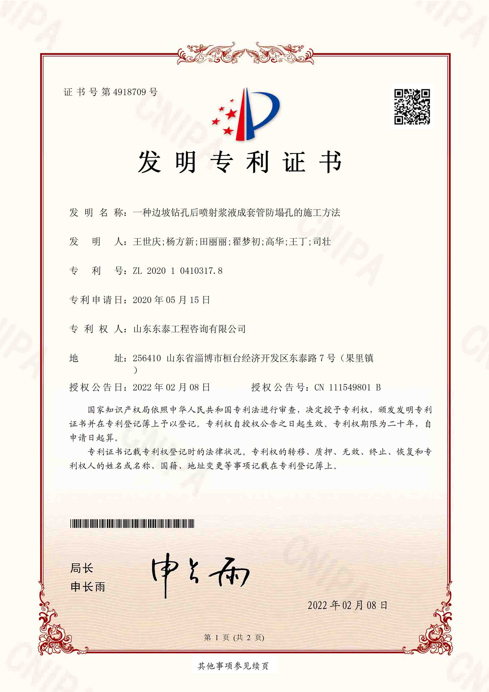 article------>{"id":6508,"cid":10,"subCid":"","title":"发明专利:一种边坡钻孔后喷射浆液成套管防塌孔的施工方法","shortTitle":"","tagId":"","attr":"","articleView":"","source":"","author":"","description":"...","img":"/public/uploads/default/2024/12/31/1735620326420_source_190021发明:一种边坡钻孔后喷射浆液成套管防塌孔的施工方法.jpg","content":"<p style=\"text-align: center;\"><img src=\"/public/uploads/default/2024/12/31/1735620335394_source_mceu_18385919361735620326950.jpg\"></p>","orderBy":null,"status":0,"pv":582,"link":"","createdAt":"2024-11-01 00:00:00","updatedAt":"2025-07-28 11:51:32","department":null,"field":{},"tags":[]}