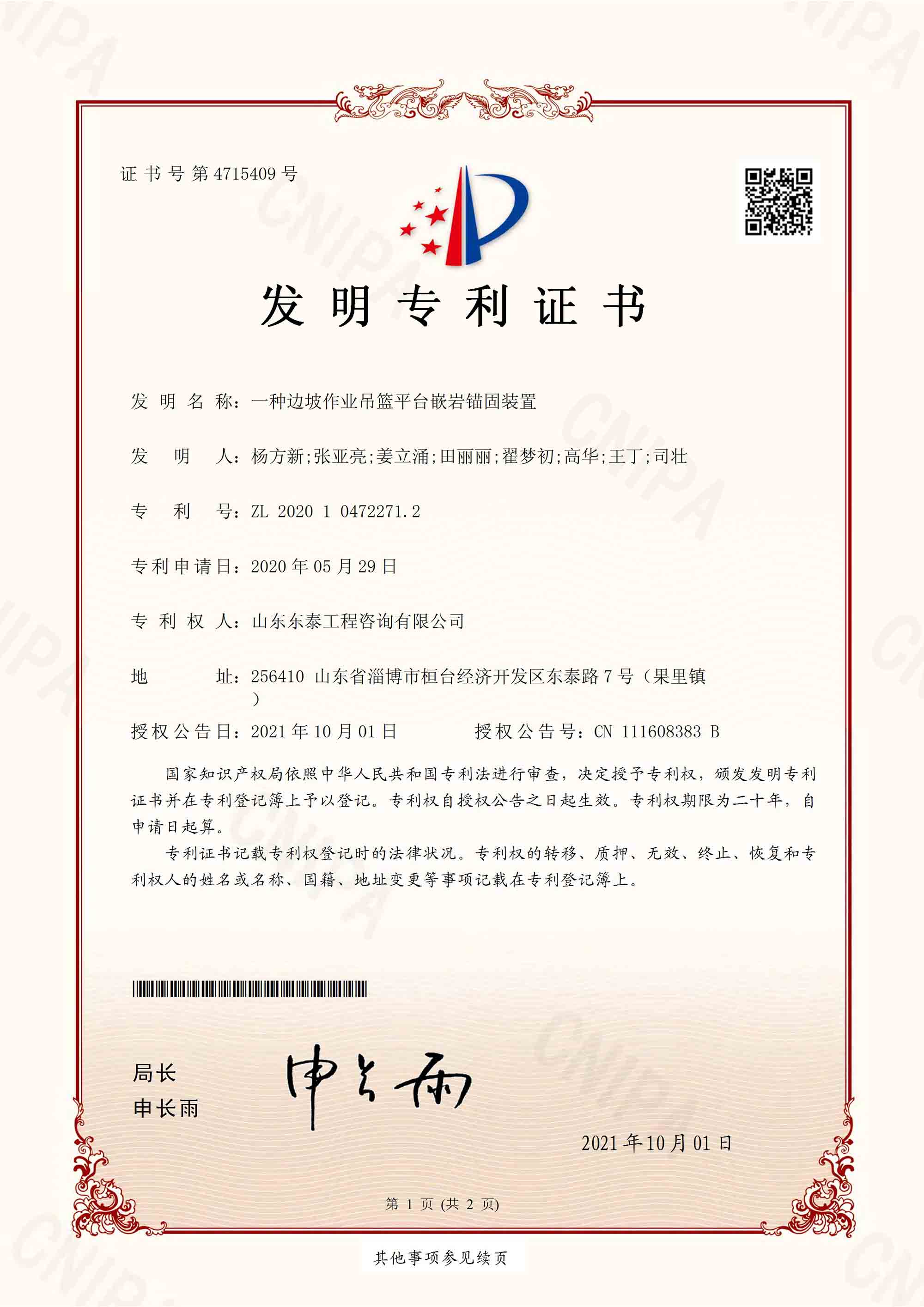 article------>{"id":6509,"cid":10,"subCid":"","title":"发明专利:一种边坡作业吊篮平台嵌岩锚固装置","shortTitle":"","tagId":"","attr":"","articleView":"","source":"","author":"","description":"...","img":"/public/uploads/default/2024/12/31/1735620391133_source_190021发明:一种边坡作业吊篮平台嵌岩锚固装置.jpg","content":"<p style=\"text-align: center;\"><img src=\"/public/uploads/default/2024/12/31/1735620405414_source_mceu_22308872571735620397025.jpg\"></p>","orderBy":null,"status":0,"pv":584,"link":"","createdAt":"2024-11-01 00:00:00","updatedAt":"2025-07-28 11:51:32","department":null,"field":{},"tags":[]}