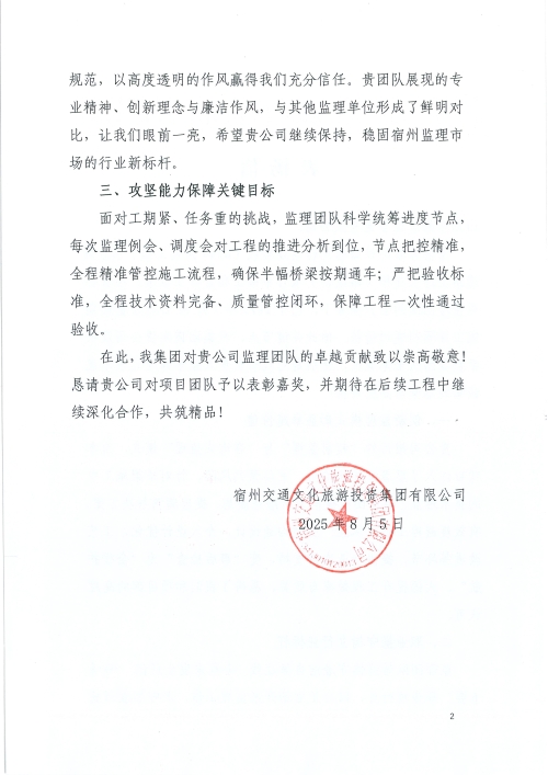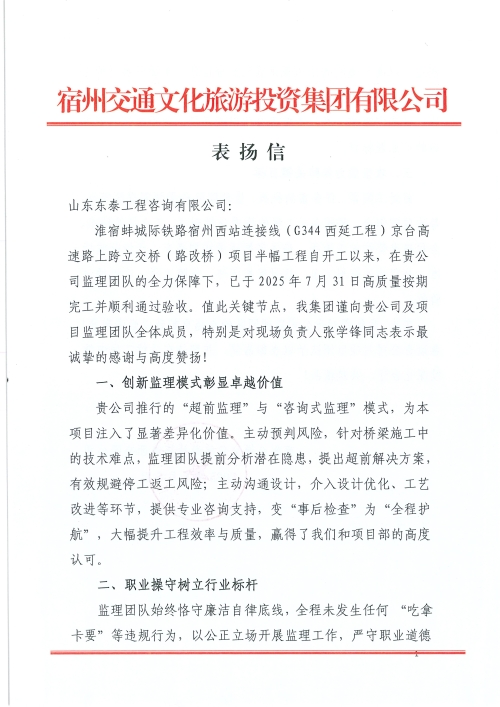 article------>{"id":7032,"cid":20,"subCid":null,"title":"喜报!东泰咨询监理的淮宿蚌城际铁路宿州西站连接线(G344西延工程)收到业主的表扬信","shortTitle":"","tagId":"","attr":"","articleView":"","source":"二公司","author":"张学锋","description":"近日,山东东泰工程咨询有限公司承监的淮宿蚌城际铁路宿州西站连接线(G344西延工程),获建设单位宿州交通文化旅游投资集团有限公司的书面表扬。\n本项目路线全长3.862公里,工程造价3.2亿元,属一级公路标准兼具市政功能,行车道为双向六车道+慢车道+人行道,建设标准高、功能复合性强,本项目需下穿京台高速(高速路改桥)、淮宿蚌城际铁路(在建)、起终点涉国省道,面临拆迁难、工期紧、多点交叉施工等多重挑战...","img":"","content":"<p class=\"MsoNormal\" style=\"text-indent: 28.0pt; line-height: 25.0pt; mso-pagination: widow-orphan; background: white;\"><span style=\"font-size: 18px; font-family: arial, helvetica, sans-serif; color: rgb(64, 64, 64);\">近日,山东东泰工程咨询有限公司承监的淮宿蚌城际铁路宿州西站连接线(<span lang=\"EN-US\">G344</span>西延工程),获建设单位宿州交通文化旅游投资集团有限公司的书面表扬。</span></p>\n<p class=\"MsoNormal\" style=\"text-indent: 28.0pt; line-height: 25.0pt; mso-pagination: widow-orphan; background: white;\"><span style=\"font-size: 18px; font-family: arial, helvetica, sans-serif; color: rgb(64, 64, 64);\">本项目路线全长<span lang=\"EN-US\">3.862</span>公里,工程造价<span lang=\"EN-US\">3.2</span>亿元,属一级公路标准兼具市政功能,行车道为双向六车道<span lang=\"EN-US\">+</span>慢车道<span lang=\"EN-US\">+</span>人行道,建设标准高、功能复合性强,本项目需下穿京台高速(高速路改桥)、淮宿蚌城际铁路(在建)、起终点涉国省道,面临拆迁难、工期紧、多点交叉施工等多重挑战。自<span lang=\"EN-US\">2024</span>年<span lang=\"EN-US\">6</span>月进场,面对<span lang=\"EN-US\">10</span>月才交付部分工作面的不利开局,东泰咨询淮宿蚌城际铁路宿州西站连接线总监办果断摒弃传统被动监理模式,主动融入项目管理,积极协调管控质量、进度、安全等工作。</span></p>\n<p class=\"MsoNormal\" style=\"text-indent: 28.0pt; line-height: 25.0pt; mso-pagination: widow-orphan; background: white;\"><span style=\"font-size: 18px; font-family: arial, helvetica, sans-serif; color: rgb(64, 64, 64);\">项目建设过程中,东泰咨询淮宿蚌城际铁路宿州西站连接线总监办始终坚持严谨细致的工作态度,对施工质量实施全过程、全方位的管控。特别是在隐蔽工程及关键工序中,监理人员严格把关,全程旁站,及时发现并督促整改各类质量问题,联合项目部先后制定了<span lang=\"EN-US\">2024</span>年“春节前攻坚计划”与<span lang=\"EN-US\">2025</span>年“雨季前决胜计划”。通过创新采用“地下先行、堆载预压”,<span lang=\"EN-US\">2024</span>年优先完成全部地下管网和涵洞工程,为<span lang=\"EN-US\">2025</span>年路基、基层施工赢得宝贵时间,实现了雨季来临前行车道完成一层水稳层的任务目标;通过督导京台高速路改桥“半幅施工、半幅保通”等方案,攻克关键节点。以“超前监理”和“咨询式监理”的理念,有效规避了潜在风险,确保了工程质量和进度。</span></p>\n<p class=\"MsoNormal\" style=\"text-indent: 28.0pt; line-height: 25.0pt; mso-pagination: widow-orphan; background: white;\"><span style=\"font-size: 18px; font-family: arial, helvetica, sans-serif; color: rgb(64, 64, 64);\">荣誉的背后离不开东泰咨询公司及二公司的正确领导,下一步,东泰咨询淮宿蚌城际铁路宿州西站连接线总监办将继续秉持“东泰咨询、让您放心”的企业口号,践行二公司“诚信为本、创新为魂、精于品质、韵于匠心”的口号,带领团队继续努力,不断擦亮“东泰咨询”品牌,为项目<span lang=\"EN-US\">2026</span>年<span lang=\"EN-US\">6</span>月早日建成通车保驾护航。</span></p>\n<p class=\"MsoNormal\" style=\"text-indent: 28pt; line-height: 25pt; background: white; text-align: center;\"><span style=\"font-size: 18px; font-family: arial, helvetica, sans-serif; color: rgb(64, 64, 64);\"><img src=\"/public/uploads/default/2025/08/29/1756432140871_source_1.jpg\" alt=\"\" width=\"500\" height=\"707\"></span></p>\n<p class=\"MsoNormal\" style=\"text-indent: 28pt; line-height: 25pt; background: white; text-align: center;\"><span style=\"font-size: 18px; font-family: arial, helvetica, sans-serif; color: rgb(64, 64, 64);\"><img src=\"/public/uploads/default/2025/08/29/1756432150626_source_2.jpg\" alt=\"\" width=\"500\" height=\"707\"></span></p>","orderBy":null,"status":0,"pv":301,"link":"","createdAt":"2025-08-29 09:48:05","updatedAt":"2026-04-17 03:34:57","department":"二公司","field":{},"tags":[]}